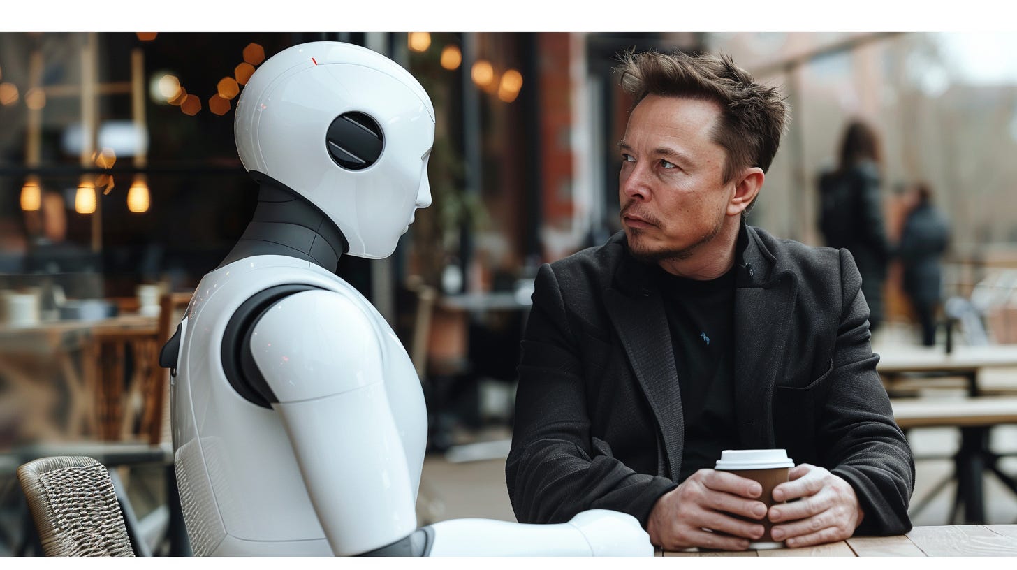 Elon Musk enjoying a cup of coffee with an android (made with Midjourney).